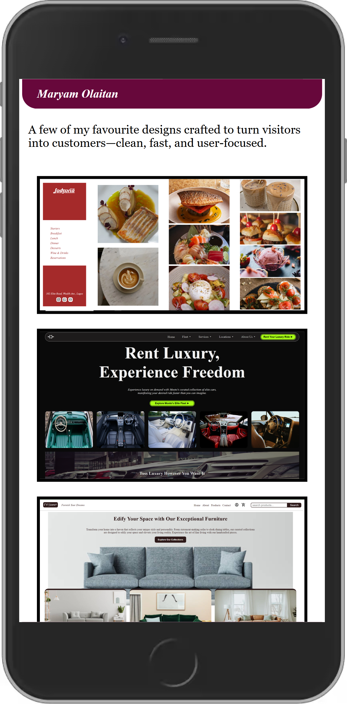 A few of my favourite designs are showcased here—each one created with a focus on clarity, usability, and impact. From sleek portfolio sites to business-focused platforms, these projects highlight my ability to balance clean aesthetics with practical results.